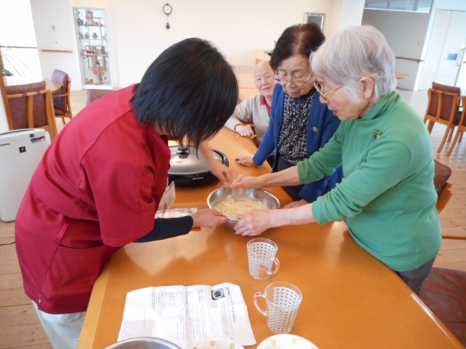 二月の調理レクはミックスベジタブルを使ったお好み焼きを作りました。