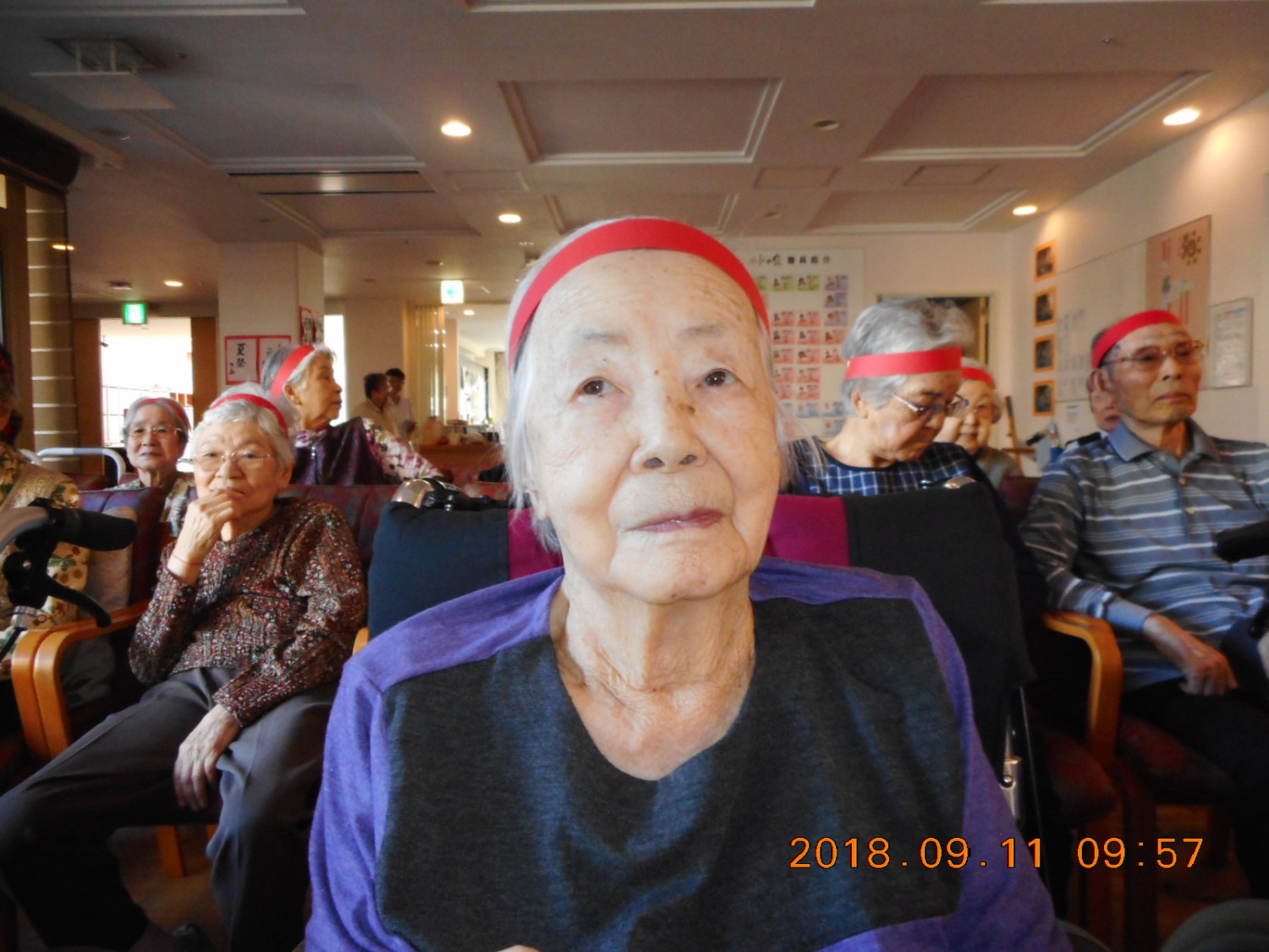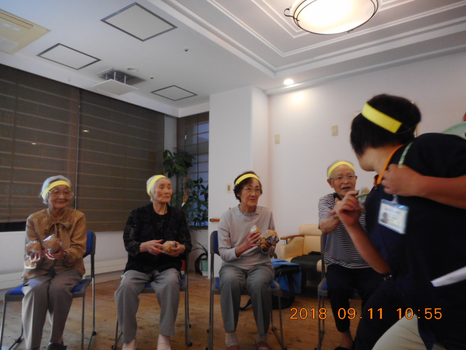 今日は、秋の大運動会を行いました。黄・青・赤の三チームに分かれ、「スリッパ飛ばし」「ピンポンだまリレー」「霊送り」「玉入れ」「パン食い競争」の競技を行いました。皆さん声援をおくりながら楽しく参加していただきました。優勝は僅差で赤組が優勝です。皆さんは金・銀・銅のメダルを胸に記念撮影をしました。